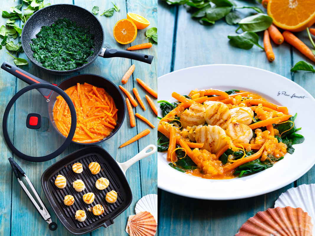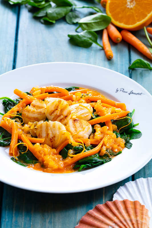 Zbylé máslo rozehřejeme a osmažíme na něm cibuli a mrkev. Lehce osolíme a pod pokličkou krátce, maximum 10 minut, podusíme. Přilijeme zredukovanou šťávu a ještě spolu svaříme až šťáva zhoustne. Dochutíme solí a pepřem. Špalíčky masa svatojakubek osušíme, potřeme olejem a zprudka opečeme, nejlépe na grilovací pánví. Hotové hřebenatky podáváme se špenátovou směsí.