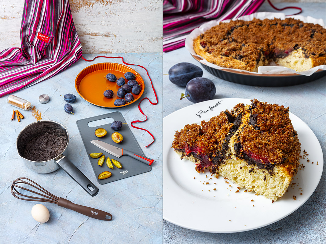 Zapneme troubu a předehřejeme ji na 180 °C. Formu na koláč vyložíme pečicím papírem a rozprostřeme do ní vykynuté těsto, které pomažeme připravenou makovou směsí, a poklademe půlkami či čtvrtkami švestek. Jestliže to tak máme rádi, můžeme posypat skořicovou drobenkou, kterou si připravíme z másla nakrájeného na menší kousky – dbáme na to, aby bylo hodně studené – do kterého přimícháme třtinový cukr se skořicí a špičkami prstů promneme všechny suroviny na drobenku tak, aby se vytvořily drobné hrudky, jimiž koláč posypeme. Poté vložíme do vyhřáté trouby a pečeme zhruba 35–45 minut nebo dozlatova.