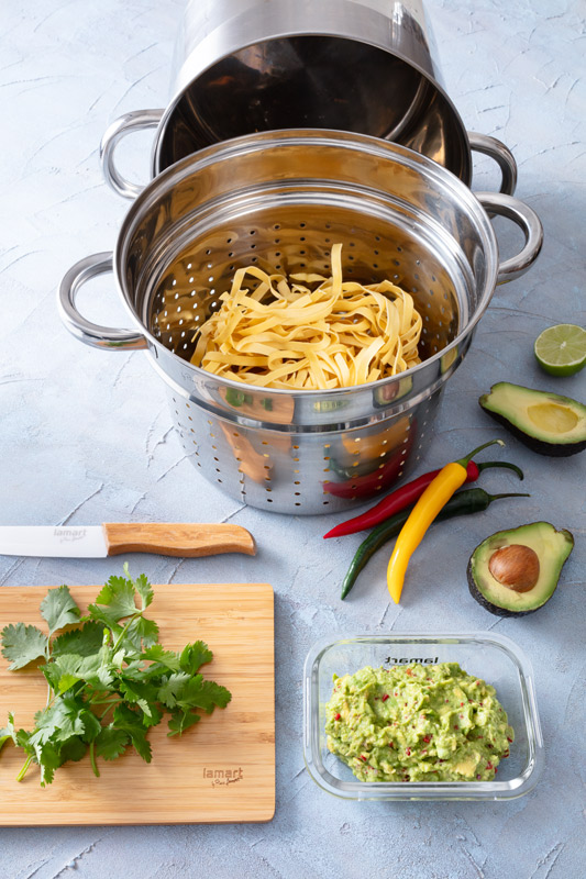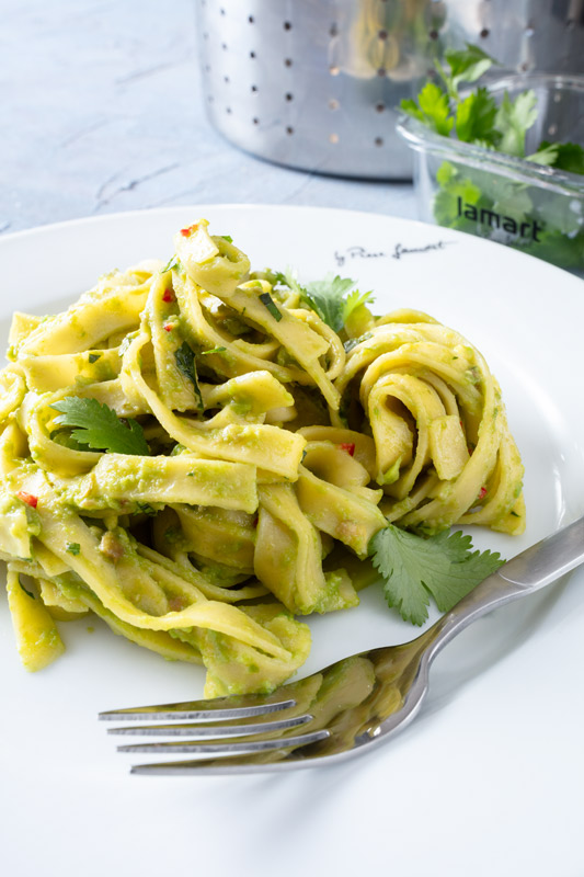 Uvařené těstoviny promícháme s máslem a poté přidáme nasekaný koriandr, avokádovou pastu a nastrouhaný parmezán.
