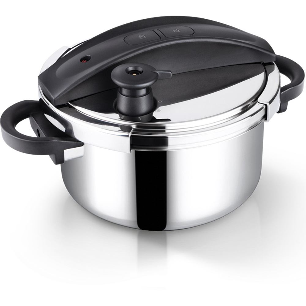 Tlakový hrnec je vybaven indikátorem tlaku, bezpečnostním ventilem, pojistkou proti přetlaku a masivními držadly pro snadnou manipulaci