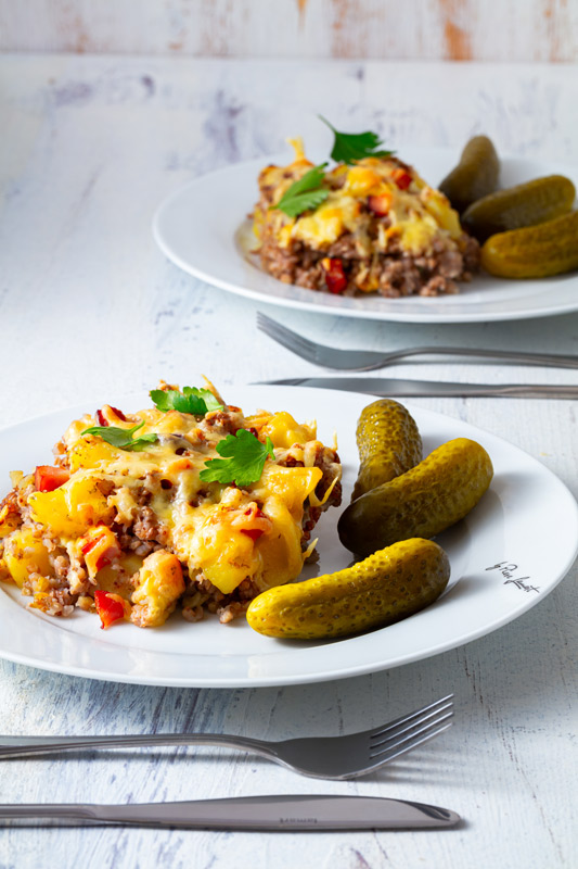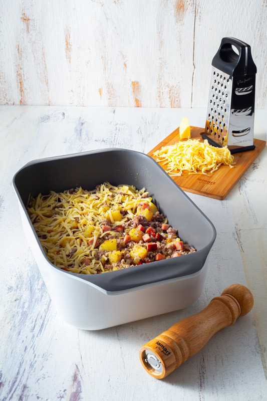 Přendáme do pekáče vymazaného zbylým sádlem. Posypeme nahrubo nastrouhaným sýrem. Pečeme 15 - 20 min  na 200°C nebo dozlatova.
