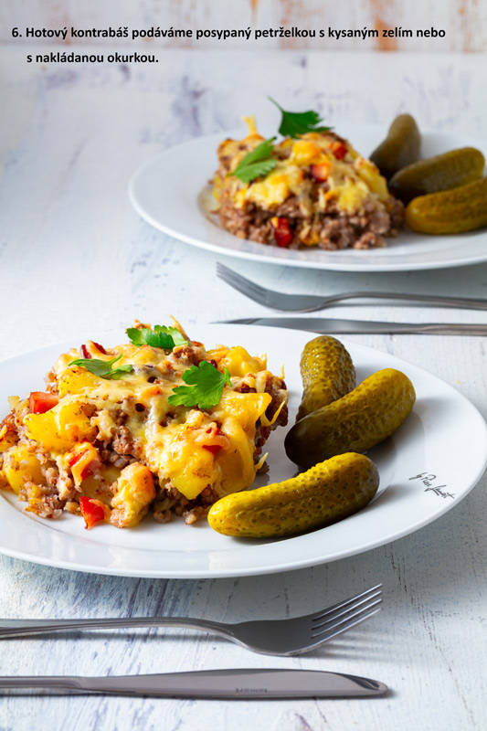 Hotový kontrabáš podáváme posypaný petrželkou s kysaným zelím nebo s nakládanou okurkou.
