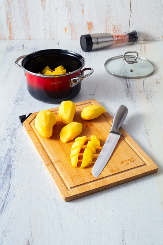 Brambory oloupáme, nakrájíme a v osolené vodě uvaříme doměkka.