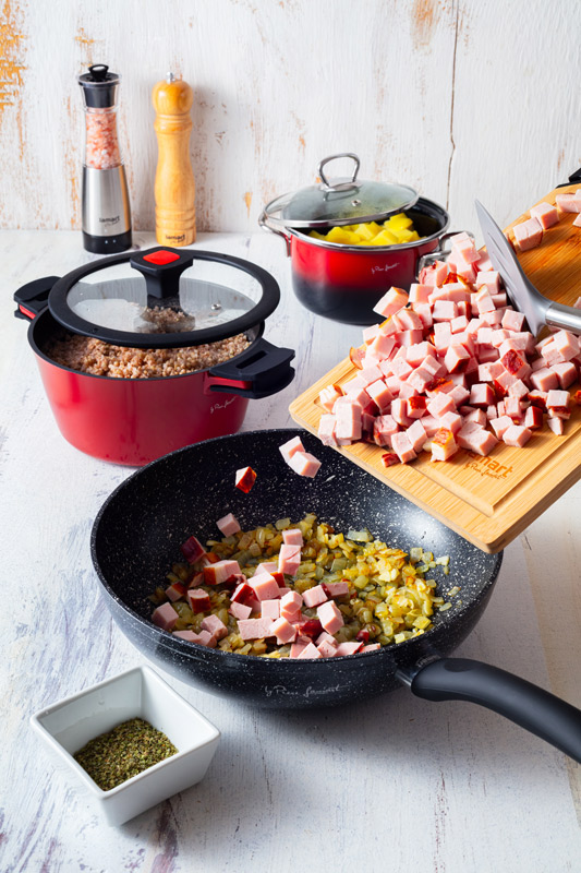Mezitím česnek nakrájíme na plátky a oloupanou cibuli a uzené maso na kostičky. Na pánvi rozpálíme 2 lžíce sádla a osmáhneme na něm cibuli, přidáme česnek a uzené maso. Po chvíli přidáme uvařenou pohanku, ochutíme soli, pepřem a majoránkou. Nakonec vmícháme uvařené, scezené brambory.