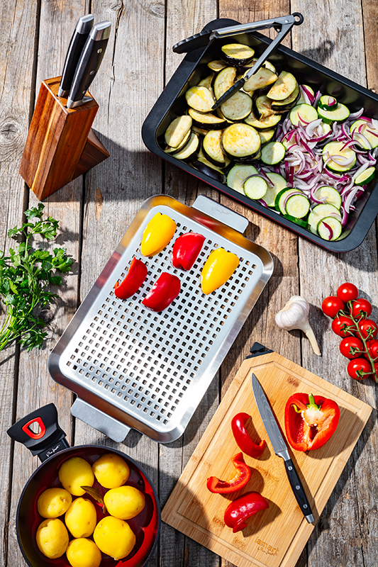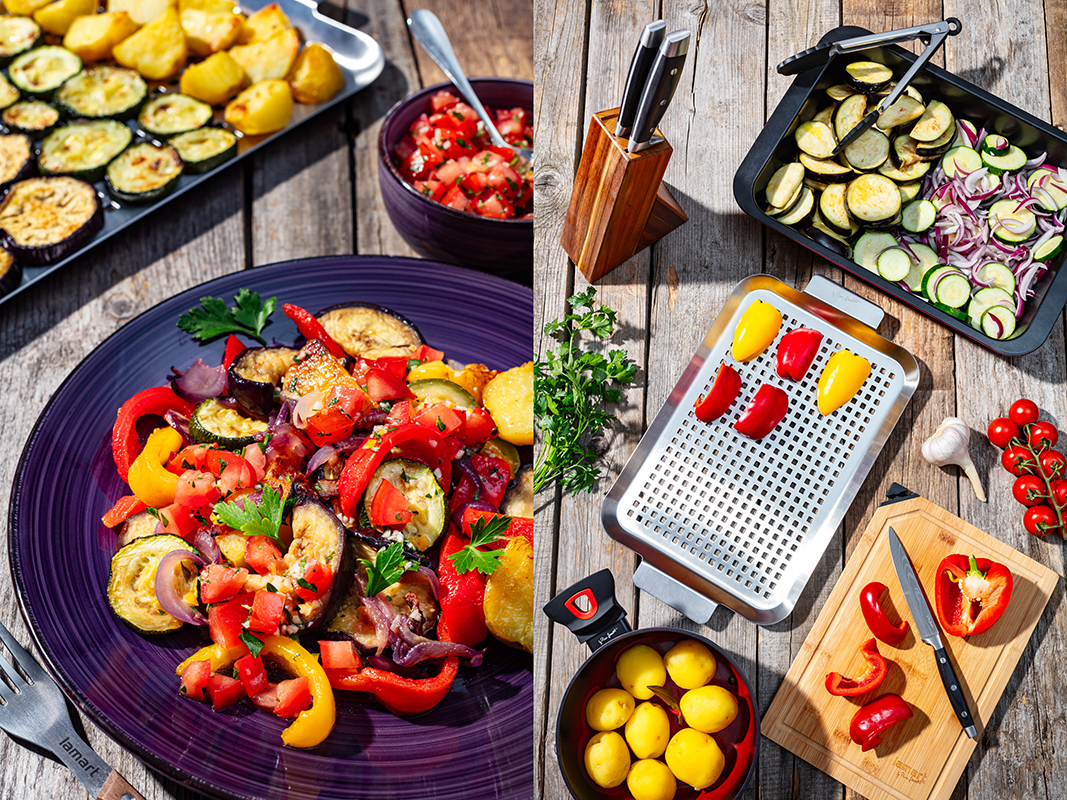 Rajčata lehce nařízneme a na cedníku přelijeme vroucí vodou, pak stáhneme slupku. Poté je nasekáme nadrobno a i se št'ávou uchováme v misce. Česnek oloupeme a prolisujeme. Nakrájenou rajčatovou dužinu smícháme s prolisovaným česnekem, osolíme, opepříme a promícháme s olivovém olejem a necháme zatím stranou. Lilky a cukety nakrájíme na kolečka cca 1 cm silné. Platky lilku osolíme a necháme "potit" aby pustili šťávu, cca 15 ndash; 20 minut. Poté je oplachneme vodou a důkladně osušíme papírovou utěrkou. Brambory omyjeme, očistíme a uvaříme v celku s bobkovým listem a par kuličkami nového koření. Necháme vychladnout a nakrájíme na čtvrtky. Očištěnou cibule nkrajíme na platky nebo na měsíčky. Papriky podélně rozpůlíme, zbavime semeníku a žeber. Pripravenou zeleninu potřeme olejem a opečeme na grilu, az zezlatnou alílky se zvlační, zhruba 10 minut (lilkům to trvá déle než cuketám). Grilovanou zeleninu skladame na sebe v míse, zakapeme čerstvým olivovém olejem, lehce osolíme a opepříme. Když je všechna zelenina opečená, rozdělíme je na talíře, přelijeme rajčatovým relishem, ozdobíme čerstvou petrželkou a hned podáváme.