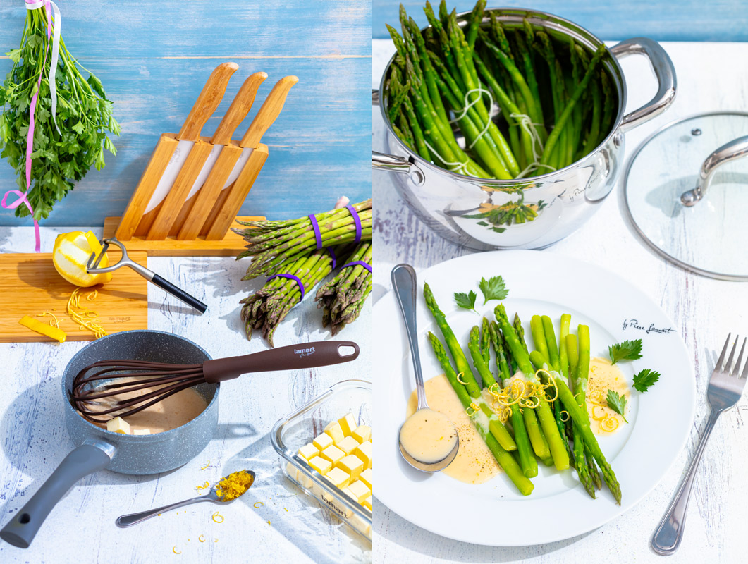 Oloupeme šalotku, nakrájíme ji na velmi drobno a zesklovatíme na 25g másla. Přilijeme bílé vino, přivedeme k varu a zredukujeme na polovinu. Přidáme horký zeleninový vývar a necháme svařit na cca 75ml. Omáčku sejmeme ze spořáku. Metličkou postupně zašleháme kousky studeného másla. Omáčku ochutíme solí, bílým pepřem a citronovou kůrou. Chřest osolíme a podáváme s omáčkou.