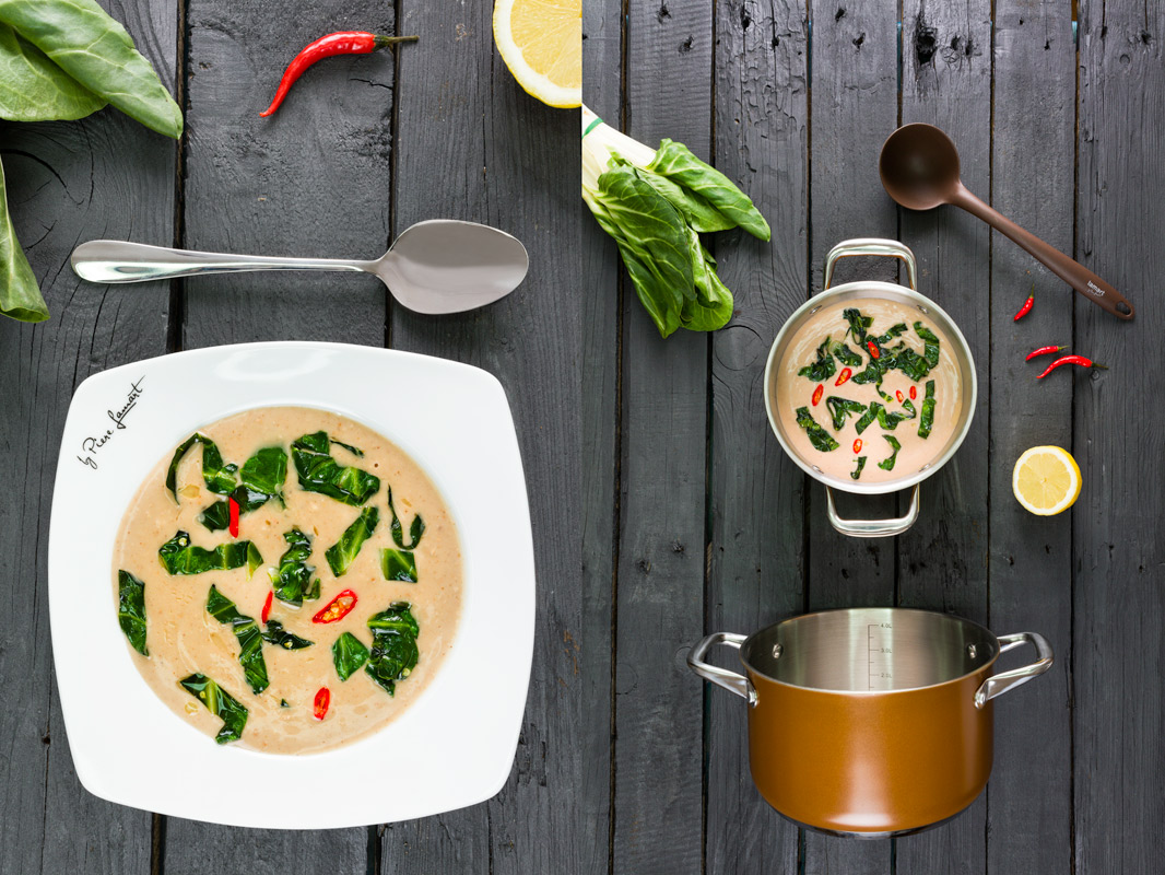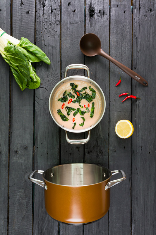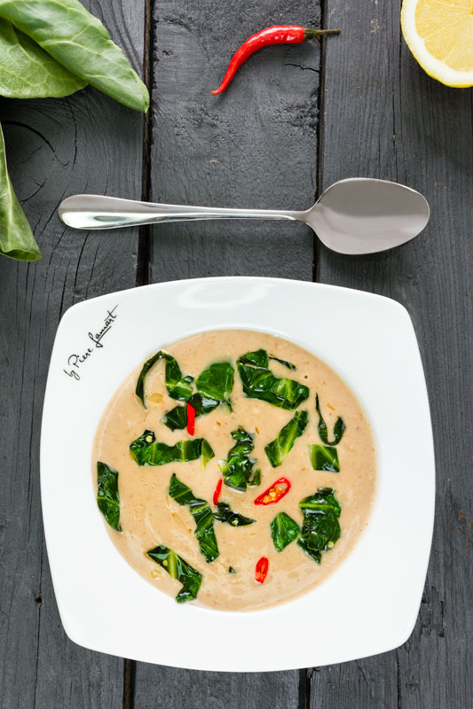 Arašídová polévka s chilli, zázvorem a restovaným mangoldem