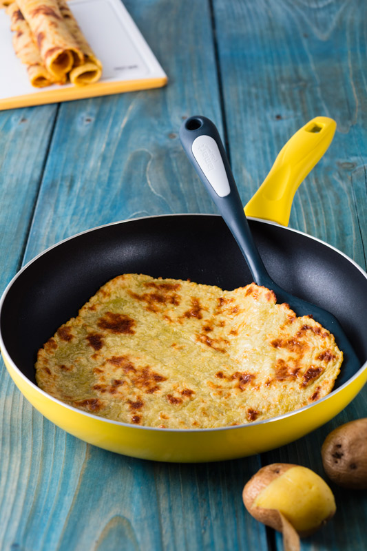 Na jemném struhátku nastrouháme brambory, osolíme a přidáme mouku. Vymícháme tužší těstíčko, které si rozdělíme na cca 12 kuliček. Kuličky pomoučníme a na desce stolu rozválíme na co nejtenčí placky.