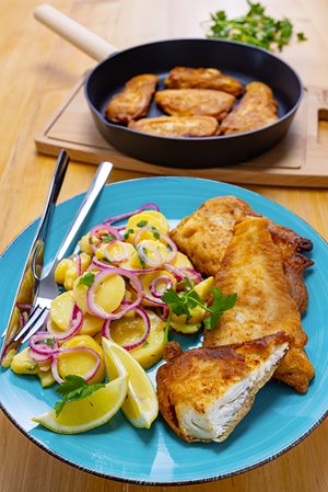 Nastrouháme citronovou kůru a vymačkáme šťávu z jednoho bio citronu. Naporcujeme filety o hmotnosti přibližně 100–150 g na osobu. Kousky ryby osolíme, opepříme, zakapeme šťávou z citronu a posypeme citronovou kůrou. Necháme marinovat asi 20 minut. Mezitím oddělíme bílky od žloutků. Z bílků a špetky soli ušleháme pevný sníh. Žloutky rozšleháme s vínem, osolíme, přimícháme mouku a nakonec opatrně vmícháme sníh z bílků. Do rozehřáté pánve přidáme olej nebo ghí máslo. Filety obalíme v těstíčku a zvolna smažíme ve vyšší vrstvě rozpáleného tuku dozlatova. Podáváme s klínkem citronu. K bramborovému salátu se hodí výborně.