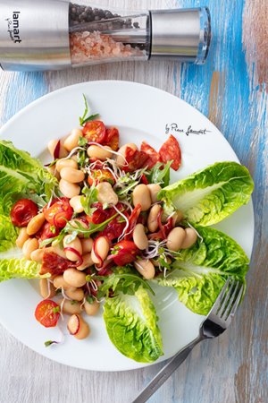 Fazolový salát s rukolou a pečenými cherry rajčátky