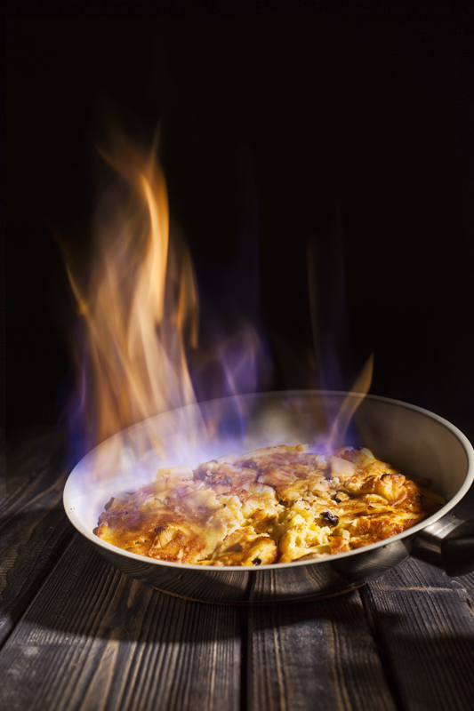 Flambovaný trhanec připravovaný jako hlavní pokrm.