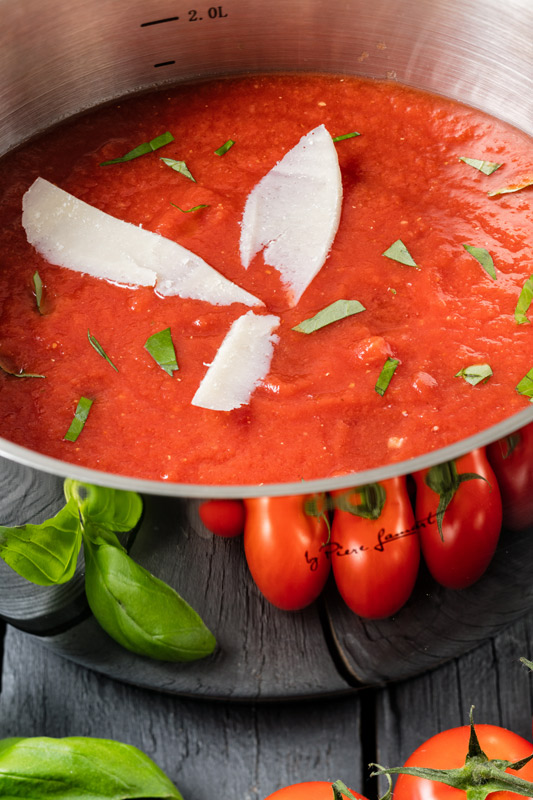 Podáváme posypané hoblinami parmezánu s opečenou bagetkou a zdobíme lístky bazalky.