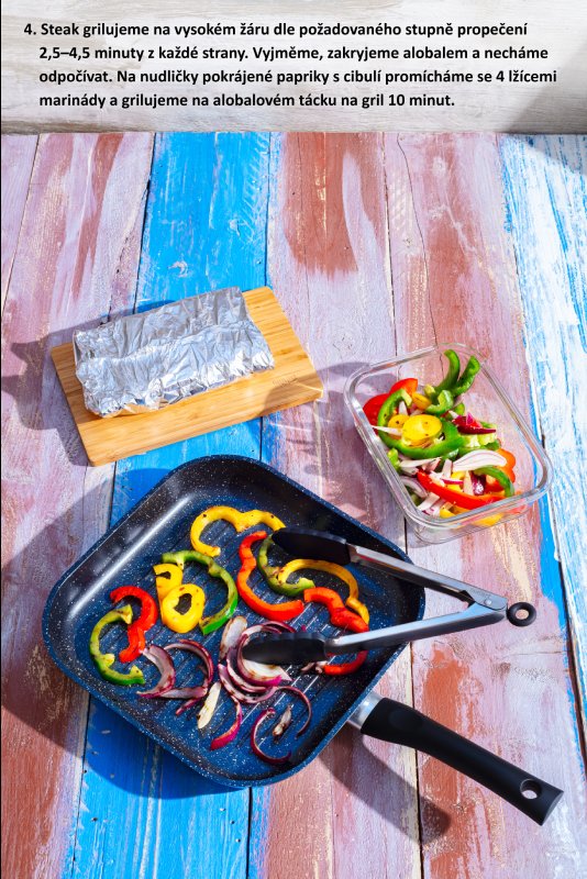 Hovězí steak grilujeme na vysokém žáru dle požadovaného stupně propečení 2,5 – 4,5 minuty z každé strany. Vyjmeme, zakryjeme alobalem a necháme znovu odpočívat.