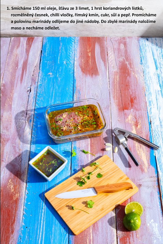 Smícháme 150 ml oleje, šťávu ze 3 limet, 1 hrst koriandrových lístků, rozmělněný česnek, chilli vločky, římský kmín, cukr, sůl a pepř. Promícháme a polovinu marinády odlijeme do jiné nádoby. Do zbývající naložíme maso a necháme odležet (nejlépe přes noc).