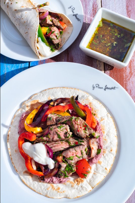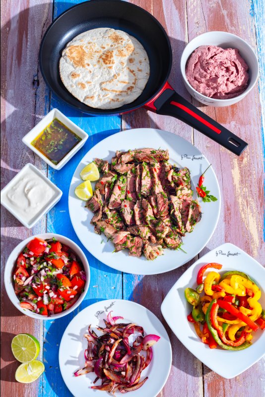 Fajitas podáváme s kouskem limety, nahřátými tortillami, upečenými paprikami, fazolovou pastou, rajčatovým salátem, zakysanou smetanou a zbylou marinádou.