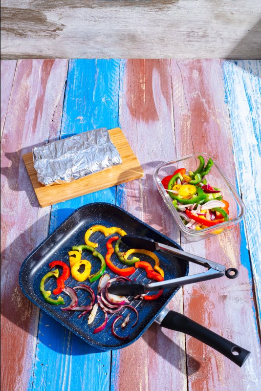Na nudličky nakrájené papriky s cibulí promícháme se 4 lžícemi marinády a grilujeme na alobalovém tácku na gril 10 minut.
