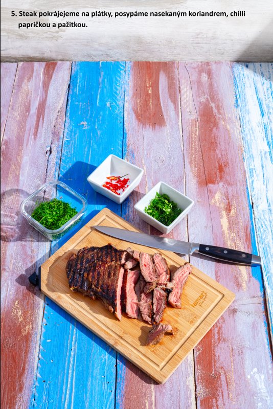 Steak nakrájíme na plátky, posypeme nasekaným koriandrem, chilli papričkou a pažitkou.