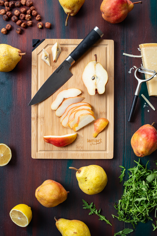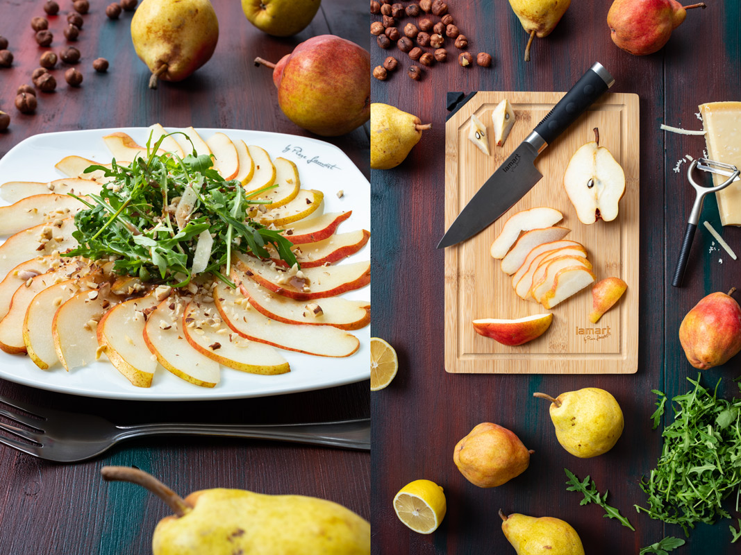 - Místo parmezánu se výborně hodí nějaký zrající plísňový sýr, který nadrobíme na hruškové carpaccio a místo javorového sirupu do zálivky přidáme med.