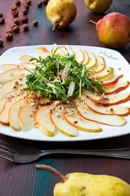Hrušky nakrájíme na tenké plátky a rozložíme po talíři. Do středu talířku navršíme dobře propláchnutou rukolu, posypeme nastrouhaným parmazánem a nasekanými ořechy.