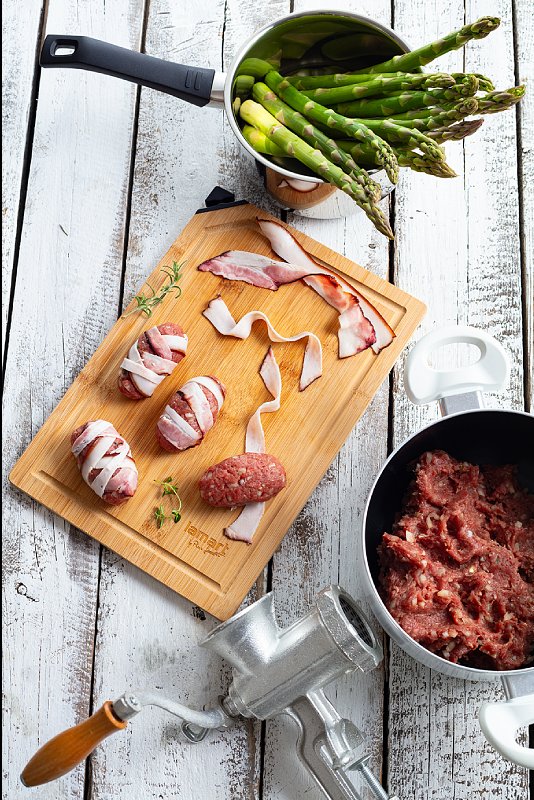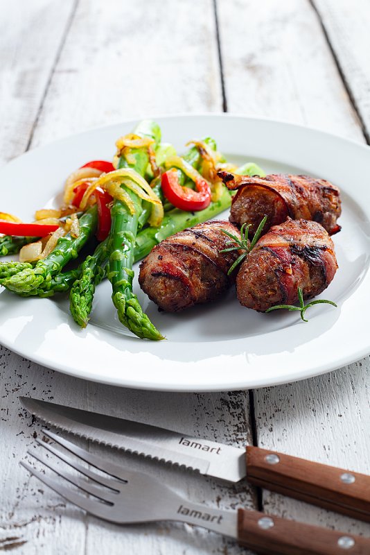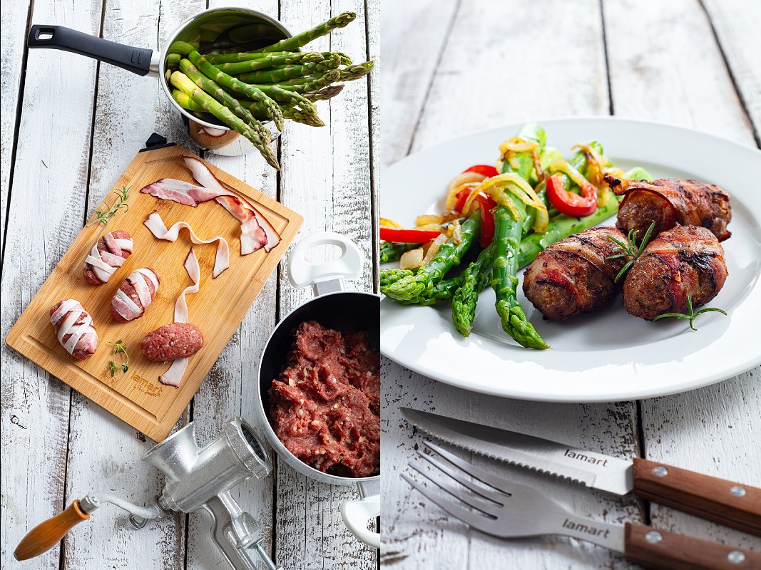 Cibuli nastrouháme najemno. Plátky slaniny podélně rozkrojíme na proužky. Maso, cibuli, strouhanku, koření a vejce spolu propracujeme v míse. Vytvoříme podlouhlé karbanátky a převážeme je proužky slaniny. V nepřilnavé pánvi rozehřejeme olej a ze všech stran na něm balíčky opečeme. Necháme okapat přebytečný tuk a podáváme s opékanou sezonní zeleninou.