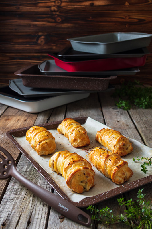 Vejce pečlivě rozšleháme a potřeme jím připravené balíčky s masem, které jsme ještě před tím vyskládali na plech vyložený pečícím papírem. Posypeme lehce kmínem a pečeme v předehřáté troubě na 200°C cca10-15 minut.