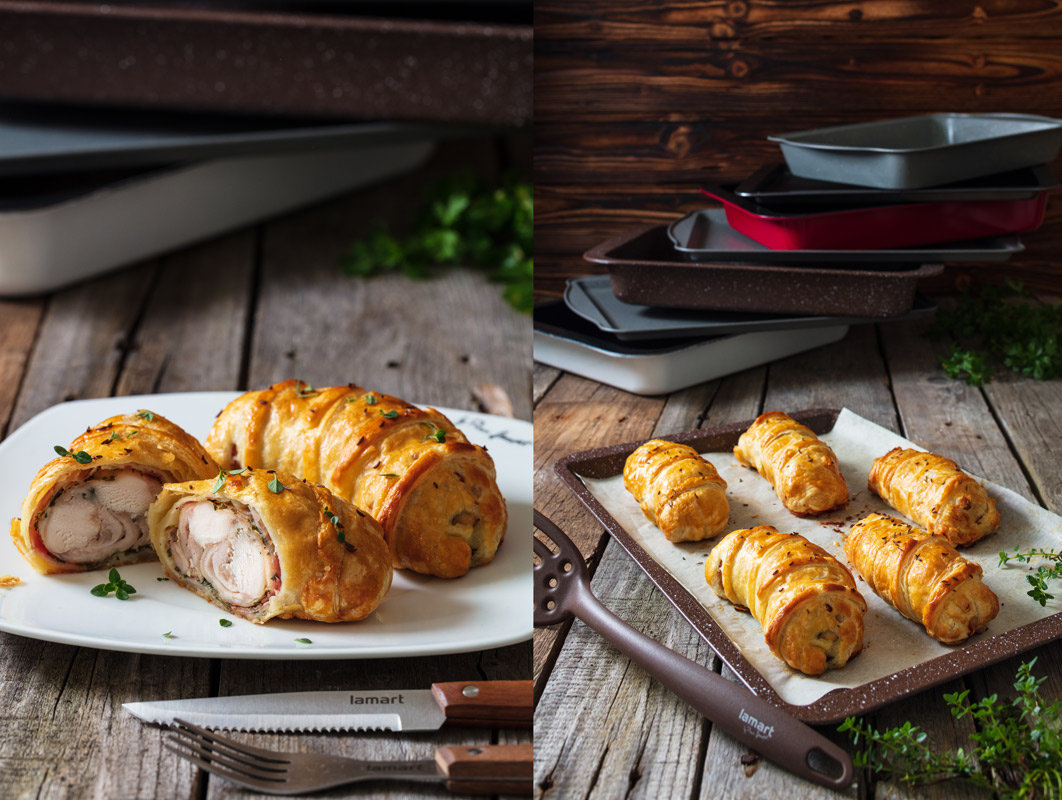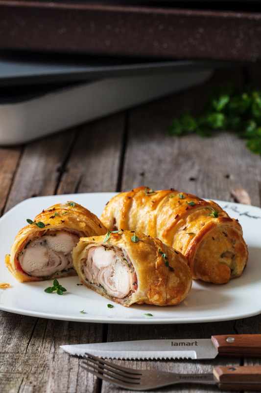 Na moukou poprášené pracovní ploše rozválíme listové těsto a rozkrájíme na čtyři díly. Do těsta postupně pečlivě zabalíme připravené maso a dobře uzavřeme.