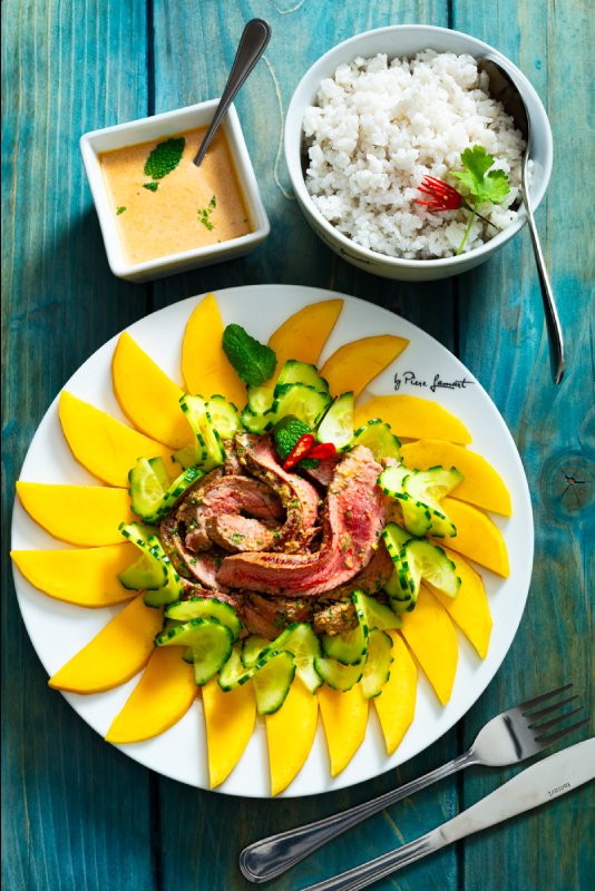 Červenou chilli papričku podélně rozpůlíme, okurku po délce ozdobně narýhujeme a nakrájíme na tenké plátky. Mango oloupeme a také nakrájíme na plátky. Stejně tak maso nakrájíme na tenké plátky, dáme ho do mísy, přidáme několik lžic hotové zálivky a promícháme s nasekanými bylinkami a citronovou trávou. Masovou směs navršíme uprostřed talíře, navrch položíme rozpůlenou chilli papričku, a okolo dekorativně rozložíme plátky okurky a manga. Podáváme se zbylou zálivkou a s kokosovou rýží.