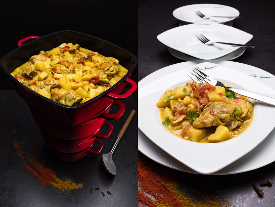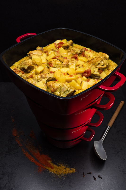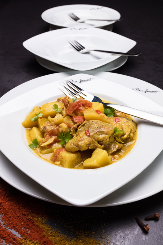 Vykostěná kuřecí stehna nakrájíme na větší kusy. Osolíme, opeříme a opečeme na rozehřátém másle. Maso vyjmeme a na zbylém másle osmahneme do sklovata nakrájenou cibuli a česnek.