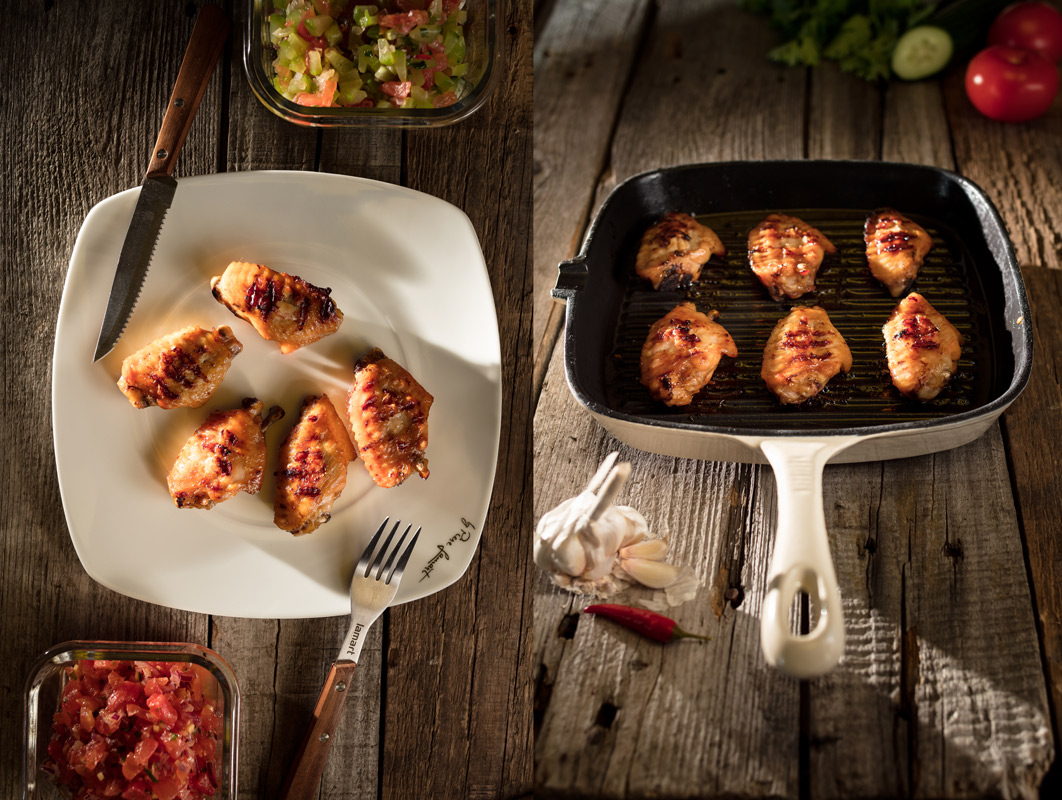 V misce smícháme kečup, ocet, sójovou omáčku, med, olej, nasekaný česnek a zázvor. Osolíme, opepříme a necháme uležet v chladu cca 30 minut. Takto připravenou marinádou zalijeme omytá a osušená křidélka, které jsme zbavili letky a nakrájeli v kloubu na kousky.