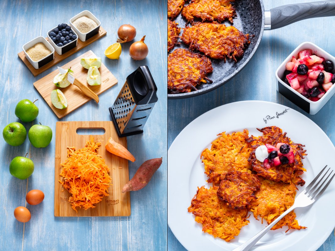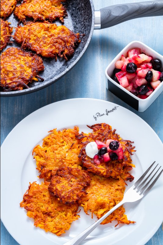Latkes podáváme teplé s jablečno - borůvkovou směsí a s jogurtem.