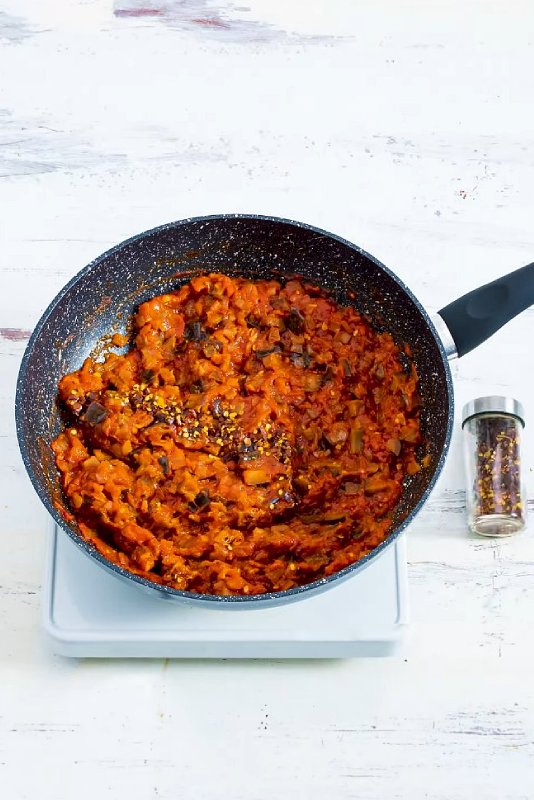 Pokrájené lilky znovu opláchneme a důkladně vymačkáme papírovou utěrkou. Na oleji zpěníme cibuli, přidáme lilek a na prudkém plamenu 6–8 minut opékáme, dokud lilek nezměkne. Přidáme česnek a smažíme další minutu. Přimícháme rajský protlak, a za stálého míchání krátce orestujeme. Vmícháme pasírovaná rajčata a vaříme dalších 10–15 minut do zhoustnutí. Ochutíme solí, pepřem, římským kmínem, skořicí, chilli vločkami, paprikou a muškátovým oříškem.
