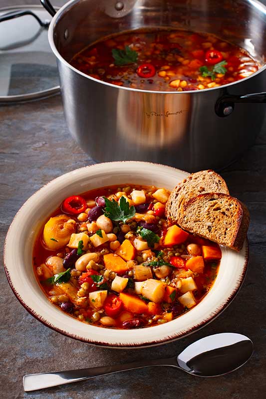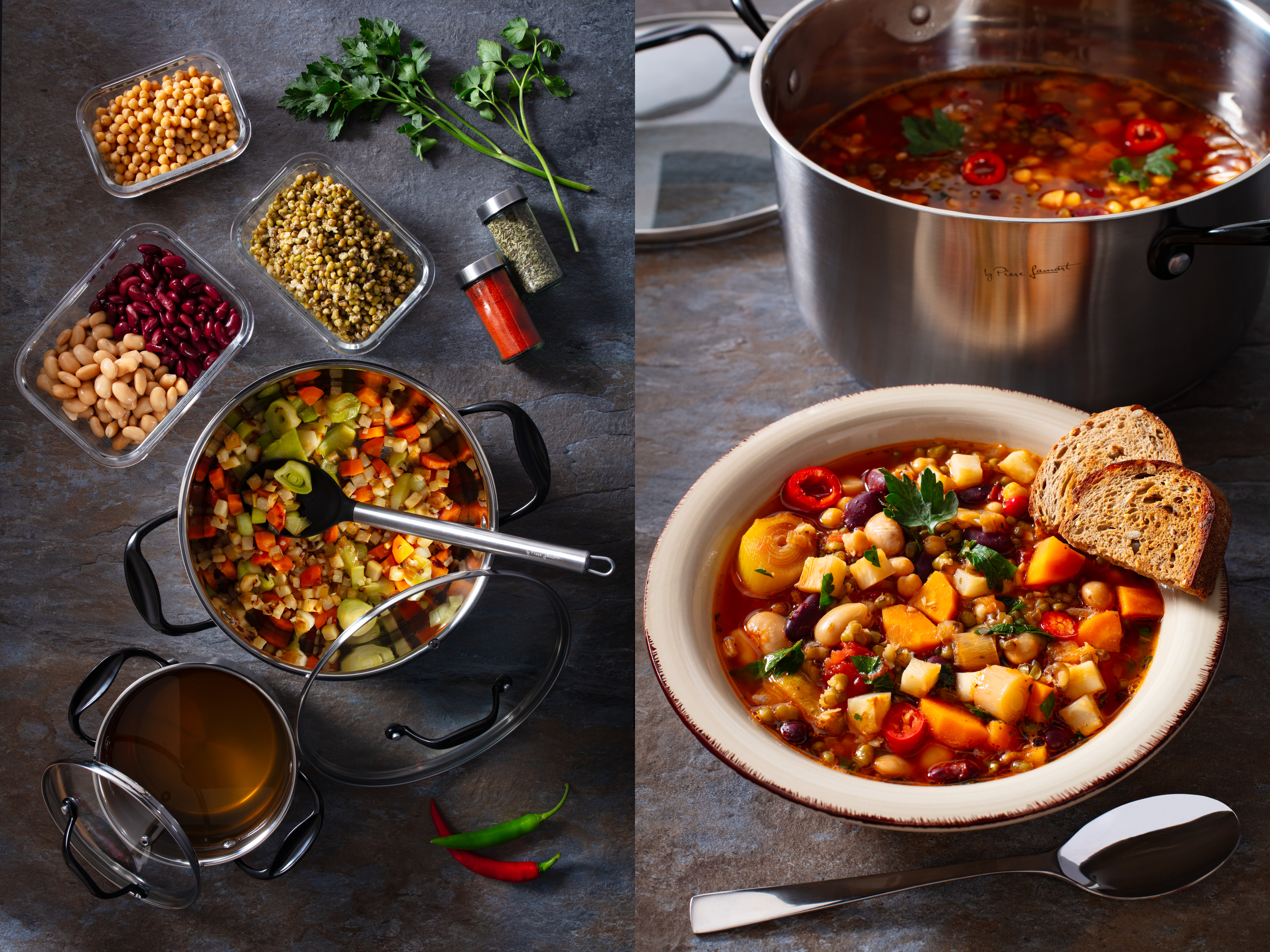 Použití směsi sterilovaných luštěnin (fazole, čočka, cizrna) šetří čas a zároveň dodává pokrmu bohatou chuť a různé textury. Přidáním bylinek až na konci zachováme jejich svěžest a aroma.