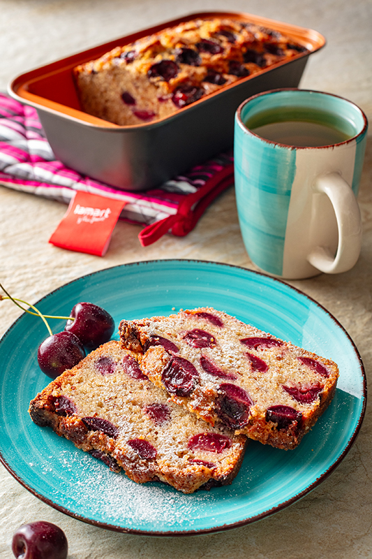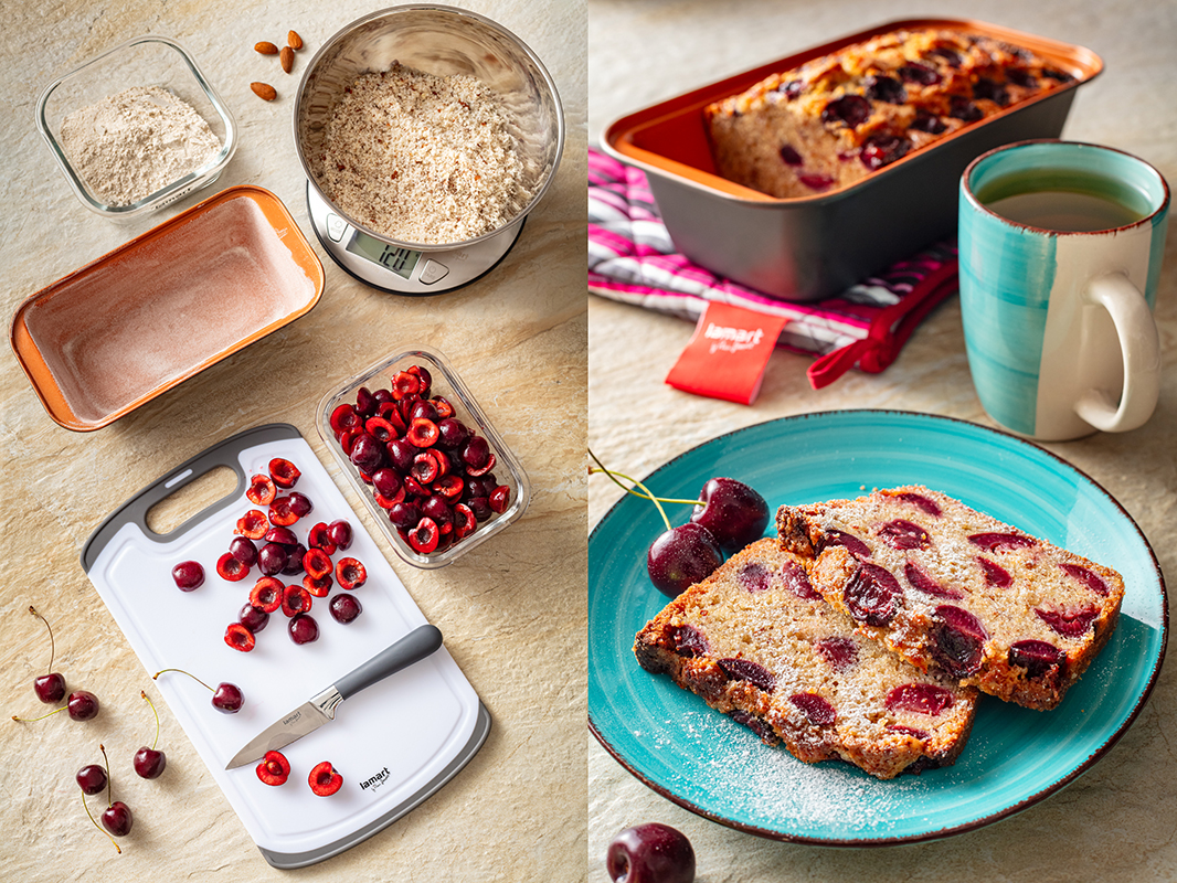 Rozevírací dortovou formu o průměru 24 cm vymažeme a vyložíme papírem na pečení. Troubu předehřejeme na 180 °C. Třešně rozpůlíme ostrým nožem a vypeckujeme. Máslo s cukrem spolu vyšleháme do pěny a ke směsi postupně po částech vetřeme vejce. Ke konci spolu s vejci přidáme 1 až 2 lžíce mouky. Pak zatřeme citronovou kůru a navrch přidáme prosátou zbylou mouku se špetkou soli a kypřícím práškem a taky vetřeme. Na závěr vetřeme ještě mandle, e×trakt a třešnovici. Je ndash; li třeba, naředíme vzniklé těsto trochou vlažné vody, aby bylo spíš řidší. Přidáme polovinu třešní, směs přesuňte do formy a uhladíme povrch. Zbylé třešně rozdělíme navrch těsta a trochu je do něj vmáčkneme. Poprášíme lžící cukru, vložíme do trouby a pečeme 50 az 55 minut. Pokud povrch příliš rychle zhnědne, volně ho přikryjte alobalem nebo pečícím papírem. Pečeme tak dlouho, až bude střed koláče pevný na dotyk. Necháme 15 minut chladnout ve formě, pak vyklopíme na mřížku k dochladnutí. Podávame poprášené trochou moučkového cukru.