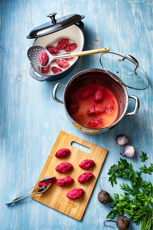 Brambory rozšťoucháme a smícháme s řepou a citronovou kůrou, rozšleháme vaječné žloutky a přimícháme do směsi, kterou pikantně ochutíme solí, pepřem, kajenským pepřem a muškátem. Následně postupně vmícháváme mouku a strouhánkou, dokud nevznikne kypré, nelepivé těsto, ze kterého vytvoříme 16–20 noků.