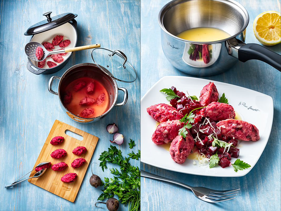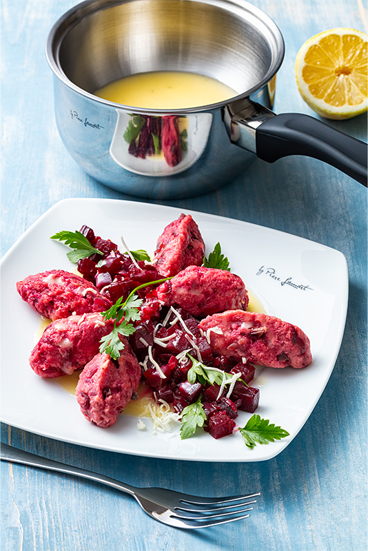 Noky z červené řepy se zeleninou a citronovým máslem