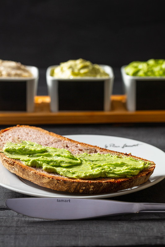 Máslo s limetkou a koriandrem, sardelové máslo s hrubozrnnou hořčicí, bylinkové máslo