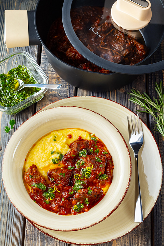 Hotovou zvěřínu podáváme se sýrovou polentou posypanou gremolatou.