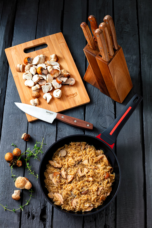 Dodáme těstoviny, zalijeme horkým vývarem a vaříme cca 10 -15 minut. V jiné pánvi zahřejeme zbyly olej a orestujeme na něm rozpůlené hříbky. Posypeme lístky tymiánu, osolíme a opepříme. Pánev sundáme s ohně a vmícháme máslo.