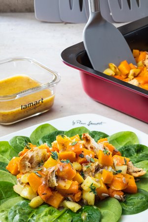 Dýni a pastinák očistíme a nakrájíme na větší kusy. Dáme do pekáče, pokapeme olivovým olejem, osolíme, opepříme, přidáme natrhaný tymián a pečeme v předehřáté troubě na 200°C asi 20 minut. Během pečení obracíme.