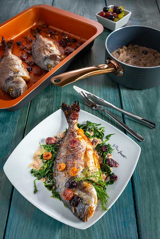 • Navrch položíme ryby a kolem nich většinu pečených kuliček hroznového vína.