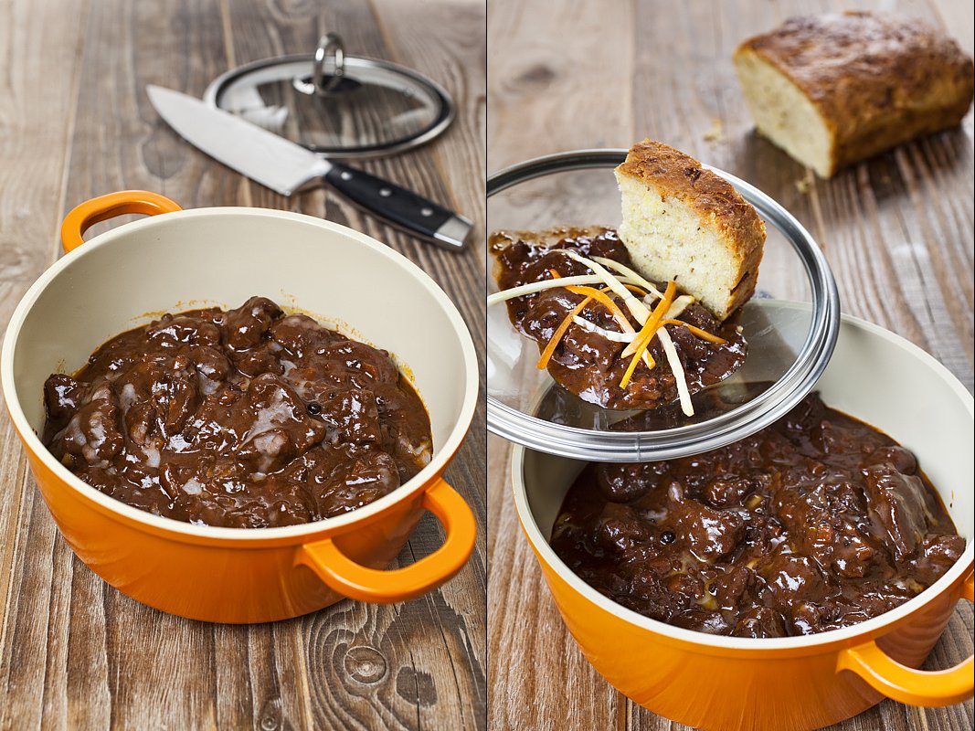Po opečení maso vyjmeme a v základu zkaramelizujeme protlak spolu s cukrem a švestkovými povidly. Zalejeme již připravenou marinádou z červeného vína, přidáme maso a na mírném ohni vaříme 70 minut. Maso po uvaření vyjmeme, omáčku dle potřeby zahustíme máslovou jíškou, kterou 15 minut na mírném ohni provařujeme. Poté maso vrátíme zpět do vzniklé omáčky. Dochutíme solí, pepřem a cukrem.