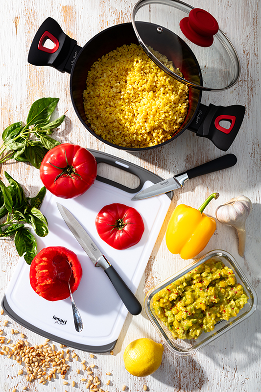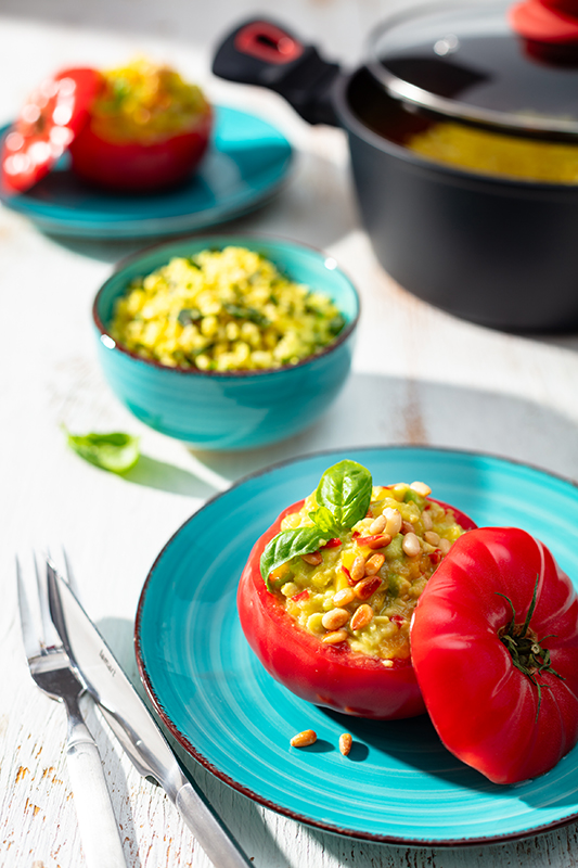 Plněné rajčata můžeme podávat jako samostatný pokrm nebo taky s uvařeným burgulem, smícháním s nasekánou rajčatovou dužinou se šťávou a nasekanou bazalkou.