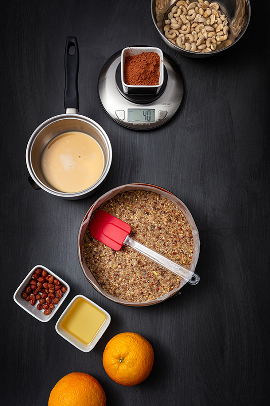 Kešu oříšky zalijeme 200ml vody a necháme nejméně 3 hodiny stát. Všechny suroviny na korpus rozmi×ujeme tyčovým mi×érem a ke konci přidáme 3 lžíce vlažné vody, aby vše spojilo. Tuto směs vtlačíme do koláčové formy o průměru 24 cm, vyložené papírem na pečení a dáme na chvíli do lednice. Ve vodní lázní si rozpustíme kokosový tuk, kakaové máslo a med, pokud není tekutý. Nyní do mi×éru vsypeme kešu i s vodou, ve které byly namočené, pak přidáme směs rozpuštěných tuků a medu a nakonec kakao, kůru a šťávu z obou pomerančů. Rozmi×ujeme všechno na jemný krém a nalijeme na vychlazený připravený korpus. Pokud chceme dortík ozdobit, asi 100 ml krému ponecháme v mi×éru, přidáme k němu lžíci kakaa a rozmi×ujeme, nalijeme spiralovitě na dort a špejlí vytvoříme pavučinu. Dortík uložíme do lednice a necháme ztuhnout nejlépe přes celou noc. Krájíme jej nožem namočeným v horké vodě, abychom nerozlamali polevu.