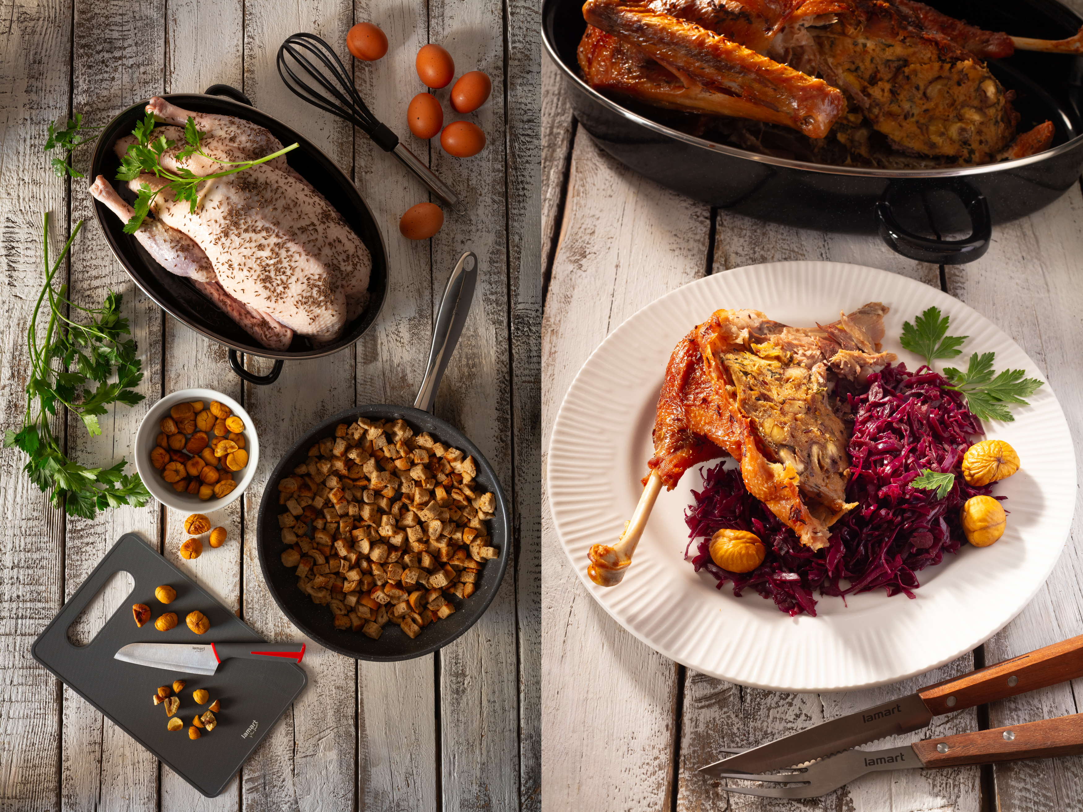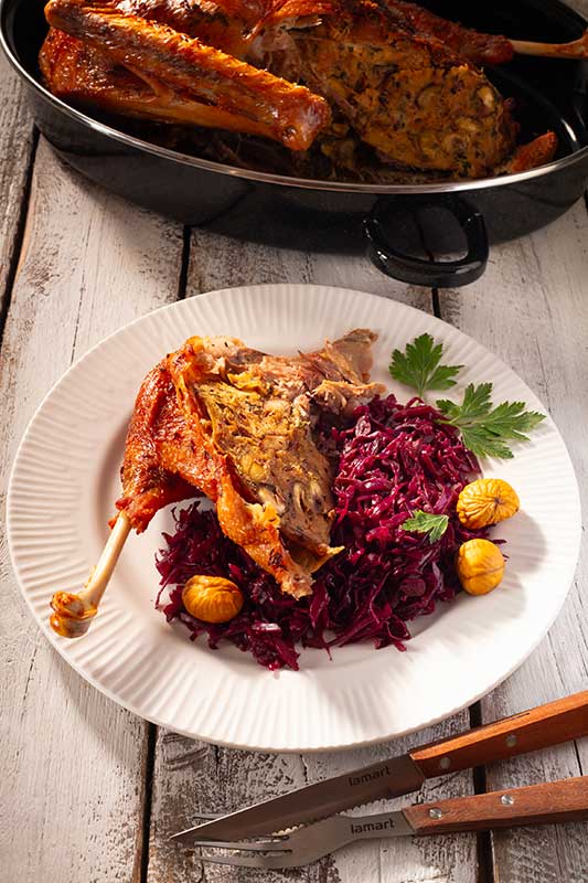 Aby byla kůže husy krásně křupavá, pečeme ji nejprve prsíčky dolů a teprve později obrátíme. Během pečení nezapomínáme pravidelně přelévat výpekem. Nádivka získá pečením jedinečnou chuť a vůni kaštanů.