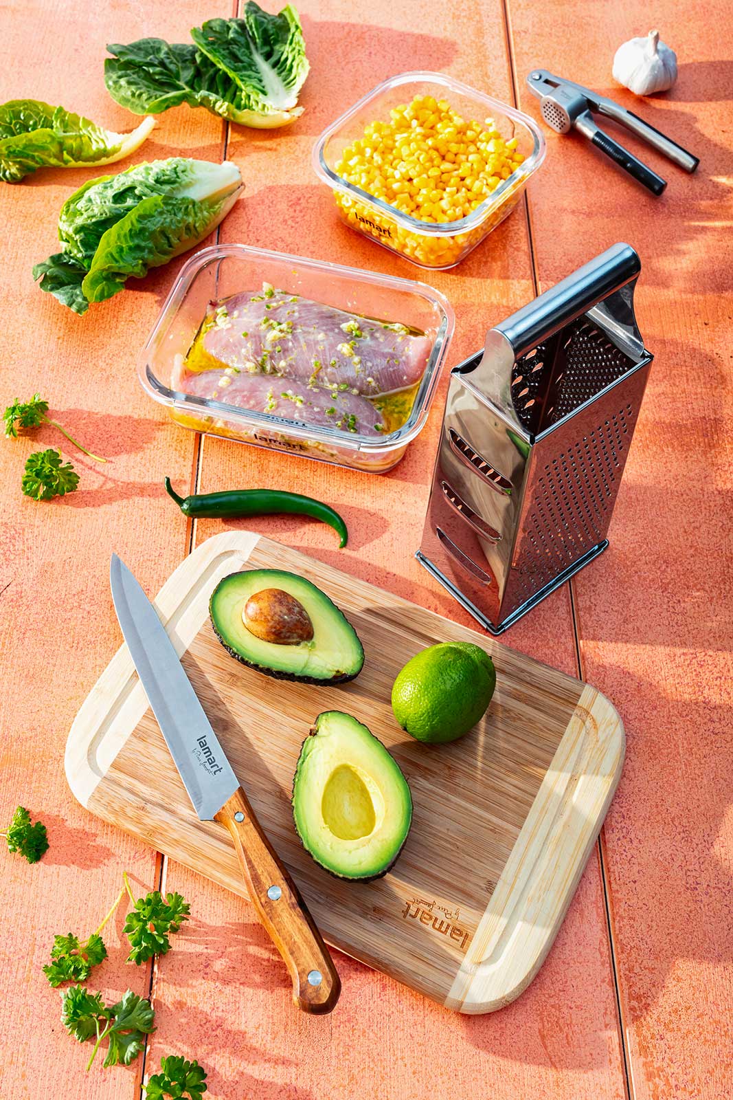 Kuřecí maso je ideální marinovat v keramické nebo skleněné nádobě, aby lépe natáhlo chuť marinády a nepřebíralo pachy z plastu.  Při odřezávání zrníček z kukuřice doporučujeme postavit klas do větší mísy nebo na prkénko s vysokými okraji, aby se zrníčka nerozsypala po kuchyni.