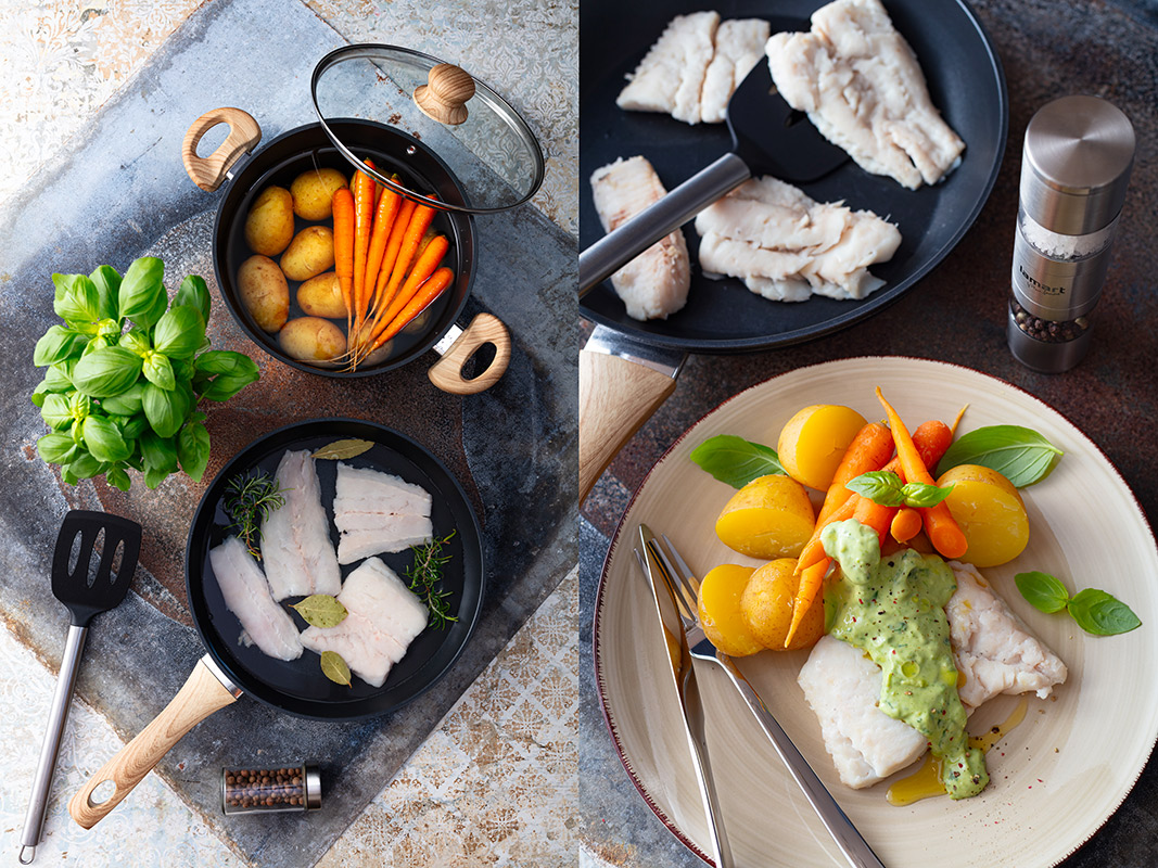 Každý filet potřeme 1 lžičkou mořské soli a odložíme. Brambory dáme do velkého hrnce, velké rozpůlíme a přelijeme vroucí osolenou vodou z rychlovarné konvice tak, aby byly lehce překryté. Vaříme je na středním ohni 10 minut, pote přidáme mrkvičky. Rybí filety opláchneme, osušíme papírovou utěrkou a položíme kůží nahoru v cedníku vytřeném olejem. Cednik s rybou dáme do hrnce s bramborami a mrkvičkami tak, aby se voda nedostala do cedniku. Hrnec přiklopíme a vaříme 10 minut nebo dokud nejsou mrkvičky uvařené a rybí maso se nerozdeluje na šupinky. Mezitím otrháme lístky bazalky do hmoždiře, přitom několik hezkých listu odložíme na zdobení. Bazalku rozemeleme a nakonec vmícháme česnekovou majonézu. Před podáváním odstraníme z filetů kůži a maso rozdělíme na talíře. Brambory s mrkvičkami scedíme, přidáme k rybám a na každý talíř dáme pěkný kopeček bazalkové majonézy, ozdobíme lístky bazalky, opepříme a pokapeme extra panenským olivovým olejem.