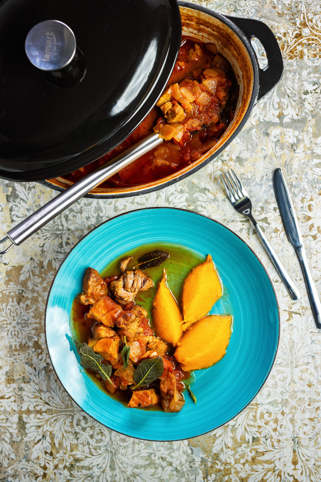 Troubu předehřejeme na 160 °C. Lístky šalvěje otrháme do velkého kastrolu s 3 lžícemi olivového oleje a osmažíme je dozlatova a do křupava. Osmaženou šalvěj vyjmeme na papírovou utěrku, olej v kastrolu ponechame. Cibuli očistíme a nakrájíme nahrubo. Vepřové maso nakrájíme na 2 cm kousky, promícháme s čerstvě mletým černým pepřem a špetkou mořské soli. Maso vložíme do kastrolu s ochuceným olejem a opečeme na středním plameni ze všech stran dozlatova. Přidáme nakrájenou cibuli a restujeme společně, dokud cibule nezměkne. Pokapeme červeným vinným octem a za občasného míchání dusíme asi 20 minut, dokud maso neztmavne a nezačne karamelizovat. Do kastrolu přidáme rajčata, která v rukou rozmačkáme, a přilijeme dvě plechovky vody. Kastrol přiklopíme, vložíme do trouby a dusíme 2 hodiny a 30 minut, dokud maso nezměkne. Během pečení ochutnáváme a případně dochucujeme. Asi hodinu a čtvrt před koncem pečení masa rozpůlíme dýni, odstraníme semena a položíme ji na plech. Potřeme ji 1 lžící olivového oleje, osolíme, opepříme a pečeme v troubě, dokud není měkká. Z upečené dýně vytvoříme pomocí lžíce nebo tvořítka kopečky a podáváme je s dušeným vepřovým masem. Na závěr maso ozdobíme křupavými šalvějovými lístky. Podáváme ideálně s čerstvým chlebem nebo bagetou.
