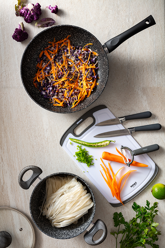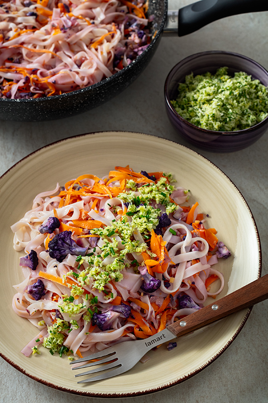 Květák a mrkev můžeme nahradit brokolice a cuketou, kterou nastrouháme na nudličky nebo ostrou škrabkou na " široké nudle". K tomu se výtečné hodí kokosový topping s chilli nebo pokud spěcháme několik nahrubo nasekaných opražených kešu nebo arašídů.