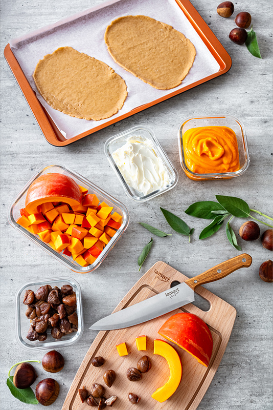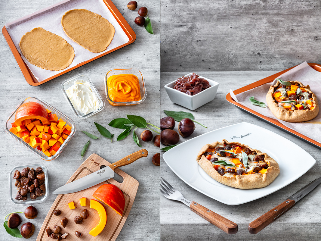 Vyndáme těsto z lednice, studené jej vyválíme přímo na pečícím papíře na tloušťku 0,3 cm do tvaru oválu a přeneseme na plech. Potřeme připraveným pyré, ale ponecháme volné okraje. Na pyré naskládáme dýni a kaštany, opět s volným krajem, protože poté, co máme připraveno, je přeložíme přes náplň. Vložíme do předehřáté trouby a pečeme 45 minut dozlatova. Následně galetky vyjmeme z trouby a z vrchu posypeme sýrem, aby se teplem rozpustil.