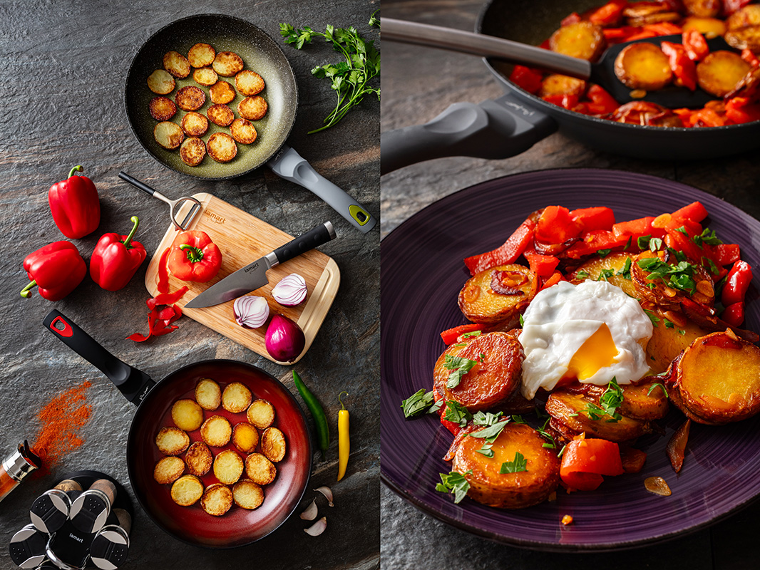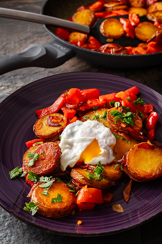 Brambory kartáčkem očistíme pod tekoucí vodou, osušíme papírovou utěrkou a příčně nakrájíme na plátky o velikosti necelý 1 cm. Ve dvou pánvích rozpálíme pokaždé 1 ½ lžíce olivového oleje. Brambory na středním plameni pomalu opékáme (plátky musejí být co nejvíce u sebe a nesmějí se překrývat). Po cca 10 minutách brambory obrátíme a opékáme dalších 8 ndash; 10 minut. Jakmile jsou brambory zvenku křupavé a uvnitř měkké, osolíme je, opepříme a vyjmeme z pánví. Paprikové lusky mezitím jemně oloupeme škrabkou na zeleninu, rozčtvrtíme, odstraníme semínka a opláchneme. Nakrájíme na kousky cca 2cm. Cibuli oloupeme, podélně rozpůlíme, poté napříč nakrájíme na cca ½ cm silné půlměsíčky. Česnek oloupeme a nakrajíme na tenky plátky. Chilli papričku rozpůlíme, odstraníme semínka, omyjeme a nasekáme. Petrželku opereme, otřepem dosucha a nahrubo nasekáme. Rozpálíme zbylý olej a zesklovatíme na něm cibuli. Přidáme papriku a za častého míchání opékáme na prudkém plameni cca 15 minut. Na poslední 3 minuty přidáme česnek a chilli. Osolíme a opepříme. Brambory smicháme s paprikovou směsi a za častého michaní opékáme dalších 5 minut. Poprášíme uzenou paprikou a dobře promícháme. Pokapeme octem a opékáme dále, dokud se ocet neodpaří. Hotový pokrm ochutíme novým novým kořením a posypeme petrželkou. Podáváme horké, se ztracenými nebo nahniličko uvařenými vejci.